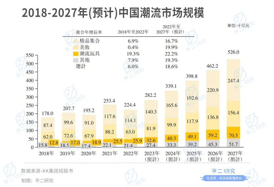 潮流零售擁有千億級(jí)別的廣闊市場(chǎng)。根據(jù)弗若斯特沙利文,2022年潮流零售市場(chǎng)規(guī)模為2244億元,預(yù)計(jì)2027年市場(chǎng)規(guī)模將達(dá)到5260億元,復(fù)合年增長(zhǎng)率達(dá)18.6%;而同期中國(guó)整體零售市場(chǎng)規(guī)模年復(fù)合增速為6.0%。