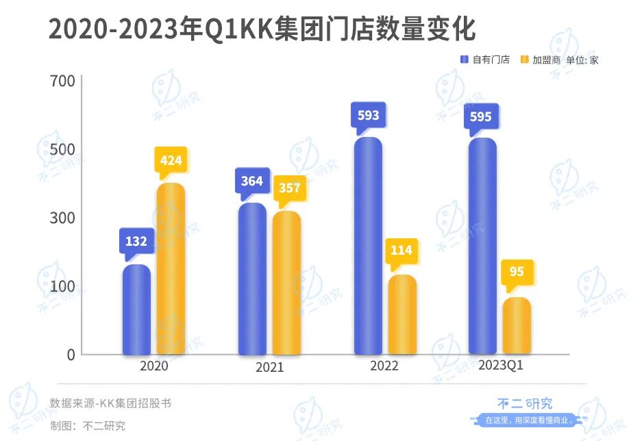 2020-2022年,KK旗下加盟商從424家快速減少至114家,同期自有門(mén)店增加至593家;但2023年一季度,KK自有門(mén)店增加2家,加盟店卻關(guān)閉了19家。