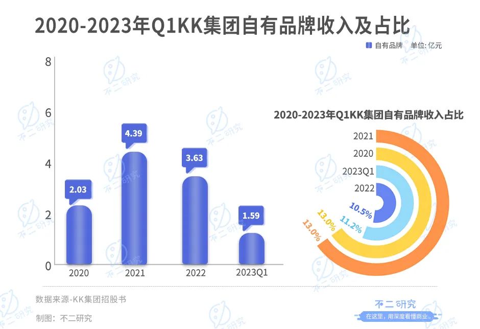 另外,自有品牌占比較少始終是KK經(jīng)營(yíng)中的一根刺。2020-2022年以及2023年一季度,KK自有品牌貢獻(xiàn)營(yíng)收占比分別為13.0%、13.0%、10.5%及11.2%。