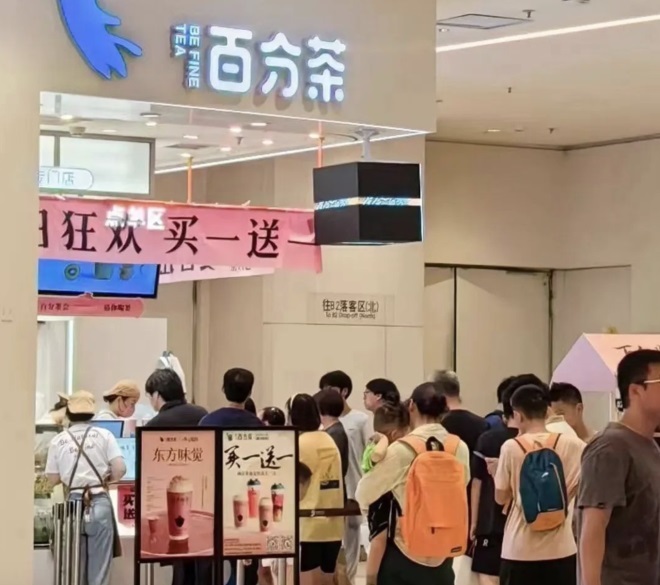 周周還發(fā)現(xiàn),不遠(yuǎn)處的百分茶也拉起了橫幅,寫著“夏日狂歡,買一送一”,并發(fā)動(dòng)店員在人流集中的位置發(fā)試飲。