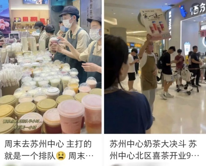 “當(dāng)時(shí)現(xiàn)場(chǎng)像極了菜市場(chǎng)。”蘇州本地消費(fèi)者周周(化名)告訴紅餐網(wǎng),喜茶開業(yè)當(dāng)天,蘇州中心B1層變得非常擁擠。而引來這些客流的,是同一時(shí)間開啟打折活動(dòng)的數(shù)個(gè)茶飲品牌。
