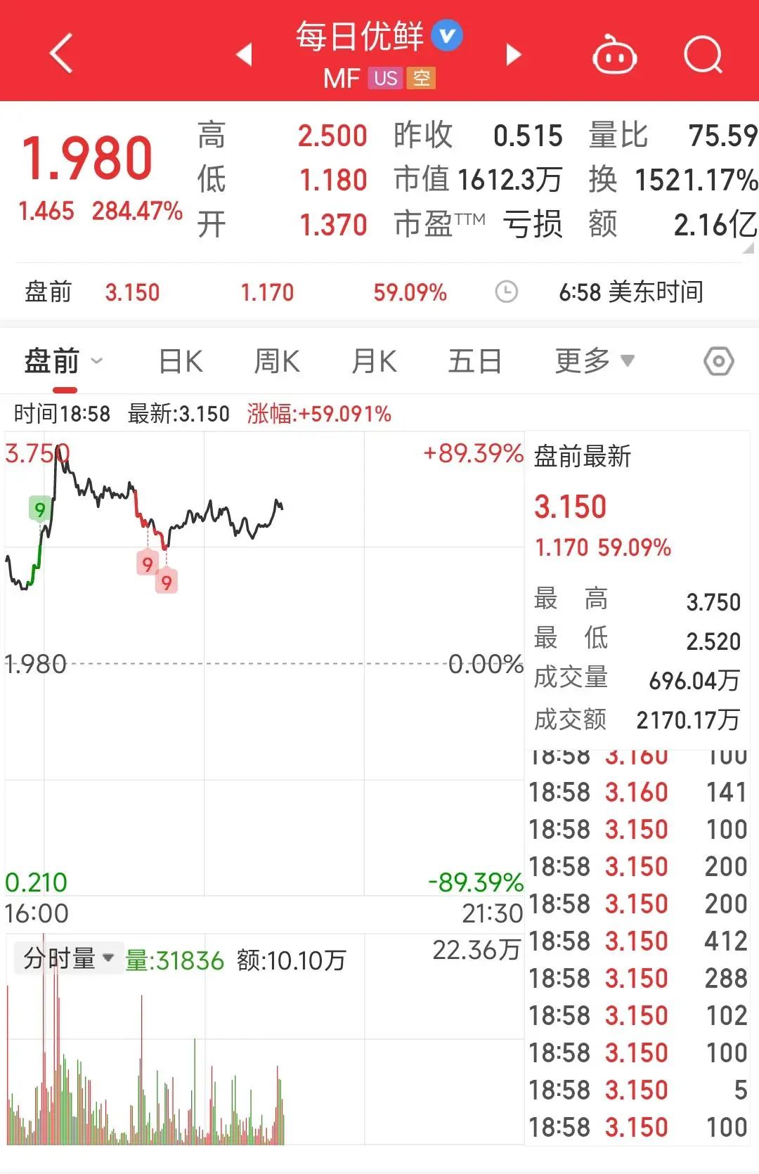 北京時(shí)間8月7日盤前,每日優(yōu)鮮繼續(xù)暴漲