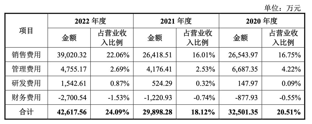 根據(jù)招股書,2020-2022年,敷爾佳研發(fā)投入分別為147.97萬元、524.29萬元及1542.61萬元,占營業(yè)收入的比例分別為0.09%、0.32%及0.87%。形成明顯對比的是,這三年敷爾佳的銷售費用分別為2.65億、2.64億、3.90億,銷售費用率分別為16.75%、16.01%、22.06%。