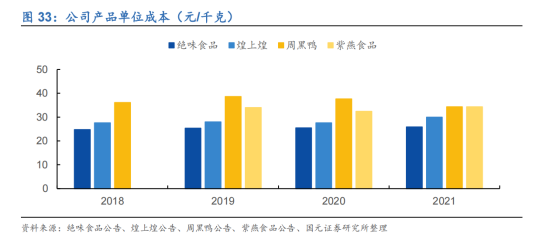 有了穩(wěn)定的上游供應(yīng),疊加門店規(guī)模和供應(yīng)鏈優(yōu)勢,以及“一個(gè)市場、一個(gè)生產(chǎn)基地、一條配送鏈”的生產(chǎn)經(jīng)營模式,這種分布式產(chǎn)能為絕味帶來了絕對成本優(yōu)勢。2021年,公司單位成本為25.87元/千克,低于同行煌上煌29.97元/千克,周黑鴨34.36元/千克以及紫燕食品34.34元/千克。