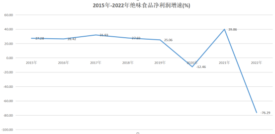 從數(shù)據(jù)來看,絕味的凈利增長自2017年達(dá)到31.93%后,便連續(xù)下滑,至2019年只有25%的增速。受疫情影響,絕味的盈利變得越來越困難,2022年公司凈利潤更是達(dá)到上市以來的“谷底”,僅有1.73億元。