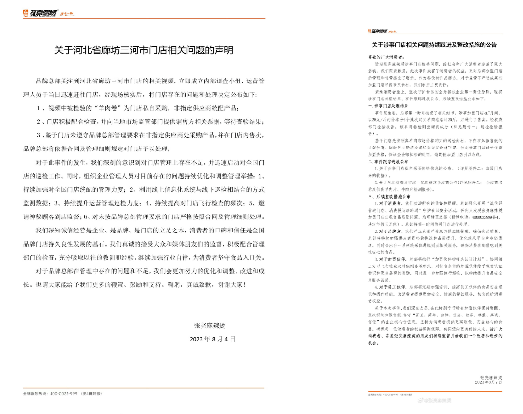 但重“利”輕“責(zé)”的張亮麻辣燙并不在乎這些 ,品牌方在聲明中避重就輕,僅一句“作為餐飲特許品牌方,對(duì)于監(jiān)管不嚴(yán)造成某些加盟門店私自采買食材,我們承擔(dān)主要責(zé)任”就將過錯(cuò)輕輕揭過,并未表明是否對(duì)消費(fèi)者進(jìn)行了賠償,以及如何承擔(dān)品牌方的主體責(zé)任。