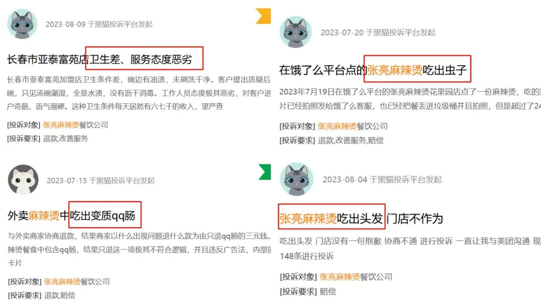 黑貓投訴平臺(tái)顯示,張亮麻辣燙累計(jì)收到603條投訴,其中不乏反映門店衛(wèi)生差、吃出蟲子等異物、食物變質(zhì)等情況。