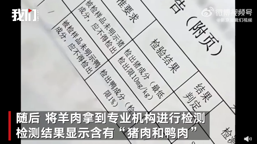 該博主表示,他在張亮麻辣燙以18元/盒的價(jià)格購買了3盒羊肉,購買時(shí)店員表示是純羊肉,并承諾假的包換。但當(dāng)博主將這份羊肉送至專業(yè)機(jī)構(gòu)檢測后,檢測結(jié)果表明,里面有豬成分和鴨成分。