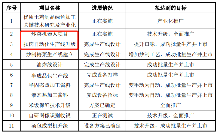 連鎖餐飲也在轉變思路,回歸降本增效的本質,而不只是追逐“無人化”的先鋒感。比如老鄉(xiāng)雞在招股書中便提到了炒菜機器人項目正在實施,扣肉自動化產線升級也已完成。