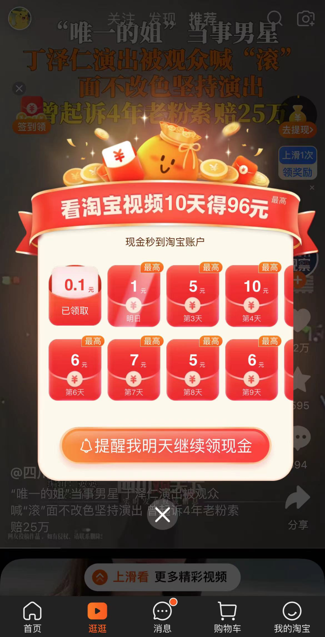 如今進(jìn)入淘寶-逛逛(視頻)后,會彈出立即簽到領(lǐng)現(xiàn)金的活動,隨后彈出的“看淘寶視頻10天得96元”的畫框。這似乎印證了進(jìn)入關(guān)于逛逛或?qū)⒏拿麨椤疤詫氁曨l”的傳聞。淘寶內(nèi)容化趨勢或進(jìn)一步加強。