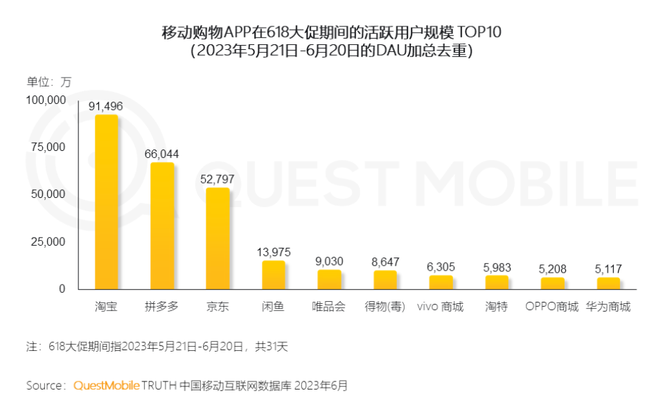 據QuestMobile報告顯示,淘寶APP的平均日活躍用戶數達4.02億,今年6.18大促期間,總活躍用戶數達9.15億,穩(wěn)居電商平臺第一位,并將領先優(yōu)勢擴大至2.5億。