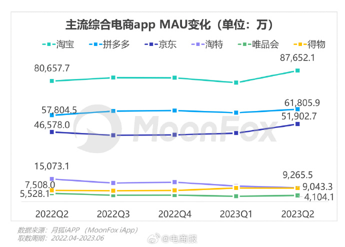 第三方監(jiān)測機構MoonFox也公布數據,主流電商APP在2023年二季度月活數據攀升明顯,淘寶環(huán)比增幅最為明顯,月活總數逼近8.77億。