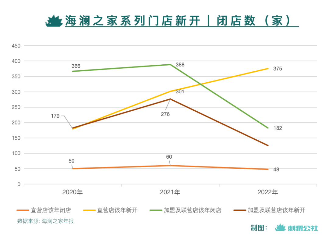 近年來(lái),海瀾之家在開新店的同時(shí),也有不少舊店閉店,且加盟及聯(lián)營(yíng)店閉店較多。2022年,海瀾之家系列直營(yíng)門店新增375家,閉店48家;而加盟門店新增125家,閉店數(shù)量卻是直營(yíng)門店的近4倍:達(dá)到182家。