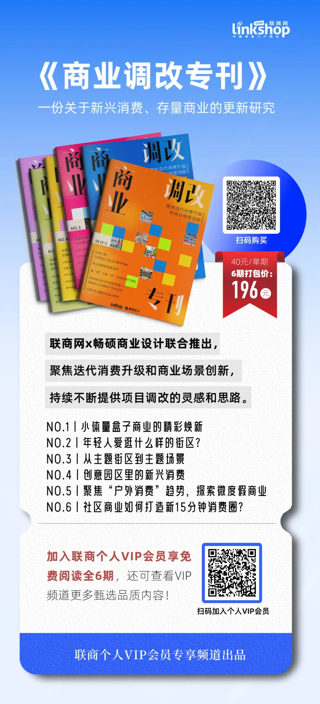 為進(jìn)一步觸達(dá)行業(yè),幫助更多人取得存量商業(yè)調(diào)改的真經(jīng),經(jīng)聯(lián)商網(wǎng)和暢碩商業(yè)設(shè)計(jì)共同討論決定,現(xiàn)將已問世的6期《商業(yè)調(diào)改?芬噪娮影娴男问竭M(jìn)行線上發(fā)售,用戶可以自行選擇購買單期專刊,也可以選擇6期套裝。