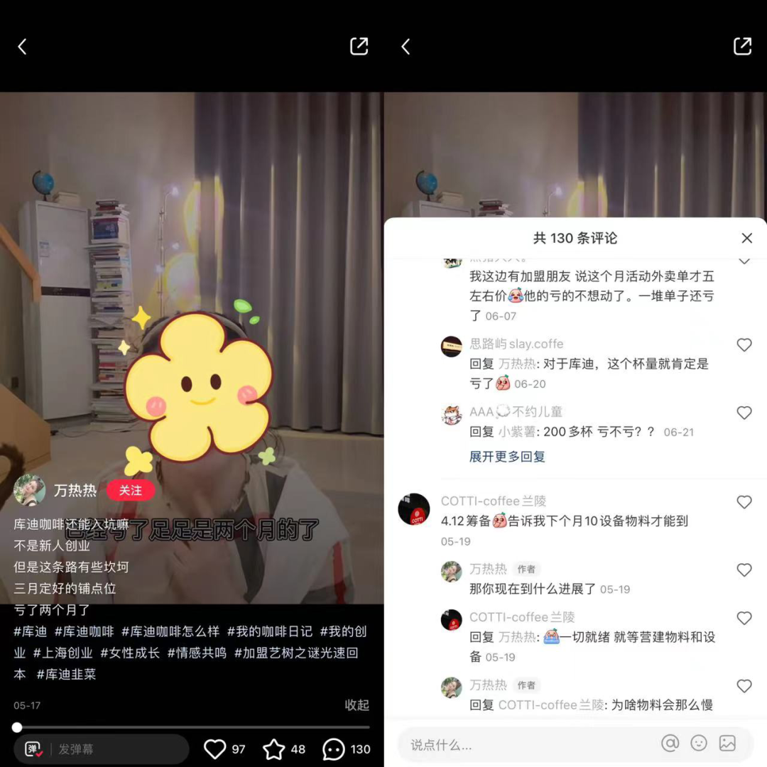 小紅書上,一位名為“萬熱熱”的加盟商發(fā)視頻表示“開店就連虧兩個月”,同時在視頻下面,不僅有評論表示其他加盟商“虧得不想動”,還有新的加盟商物料和設(shè)備跟不上開店的問題。
