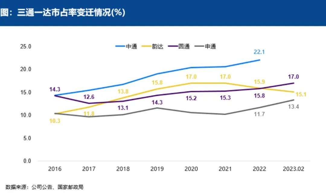 而韻達(dá)的失速同樣表現(xiàn)在市占率上。