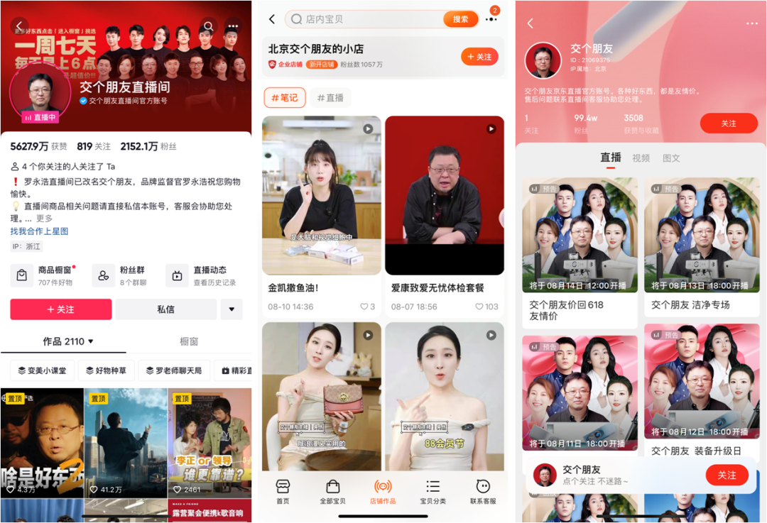 圖源“交個(gè)朋友”抖音、淘寶、京東直播間