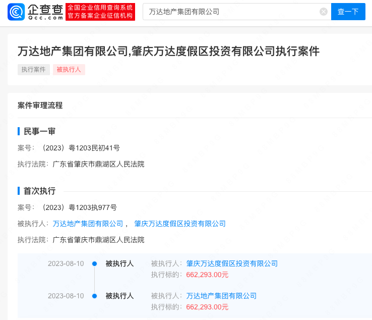 聯(lián)商快訊:企查查APP顯示,8月10日,萬達(dá)地產(chǎn)集團(tuán)有限公司新增被執(zhí)行人信息,執(zhí)行標(biāo)的66.29萬余元,執(zhí)行法院為廣東省肇慶市鼎湖區(qū)人民法院。
