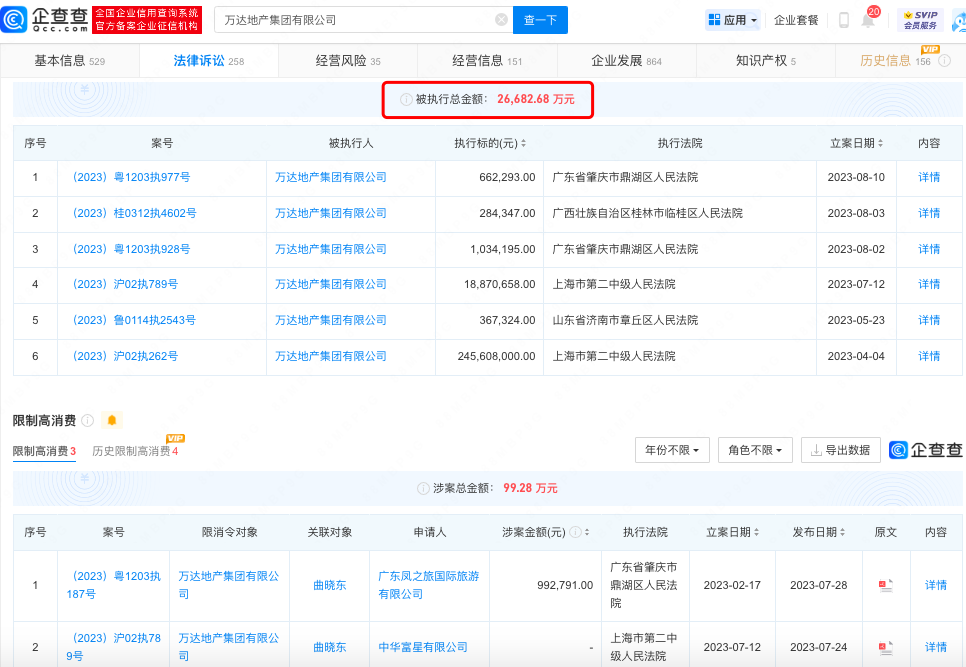 萬達(dá)地產(chǎn)再被強(qiáng)制執(zhí)行66萬,累計被執(zhí)行金額超2.6億