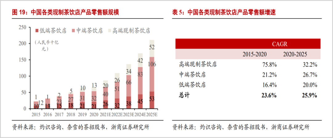 據(jù)灼識咨詢研究,2020-2025年,預(yù)計整體茶行業(yè)零售額將從4107億增長至8102億,復(fù)合增速為14.6%;而現(xiàn)制茶飲的零售額將從1135億增長至3400億,復(fù)合增速為24.5%,明顯高于茶行業(yè)整體規(guī)模增速。
