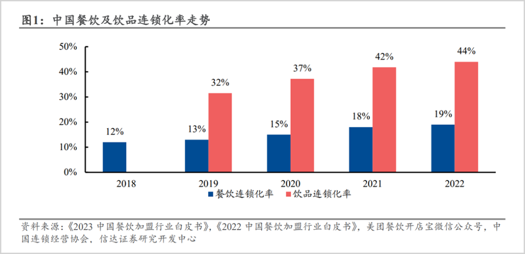 與此同時,疫情期間行業(yè)連鎖化率快速增加,整合也在加速。據(jù)美團(tuán)數(shù)據(jù)顯示,2019-2022年,中國餐飲市場連鎖化率從13%提高到19%,飲品連鎖化率由32%提升至44%。