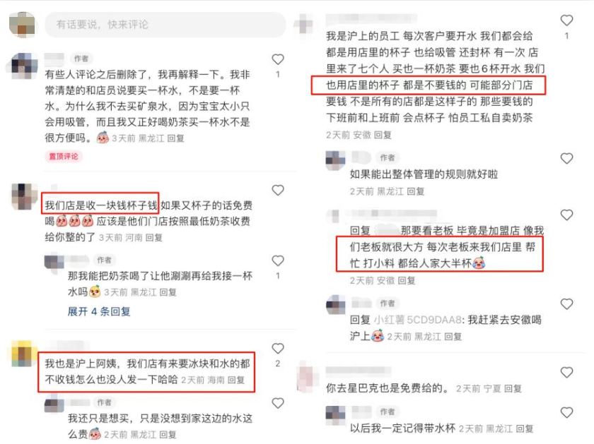 熱搜中的涉事門店解釋稱:公司規(guī)定不能單獨銷售杯子,消費者如果只要一杯白開水,就必須收一杯奶茶錢。但筆者在其他社交平臺發(fā)現(xiàn),同樣是滬上阿姨旗下門店,部分門店在消費者需要白開水或冰塊時沒有收取杯子費用,或者只收取一元。