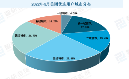 以美團(tuán)為例,2022年4月,美團(tuán)優(yōu)選的用戶在三四線城市的占比較大,均超過20%,一線城市占比最少,僅為4.35%。