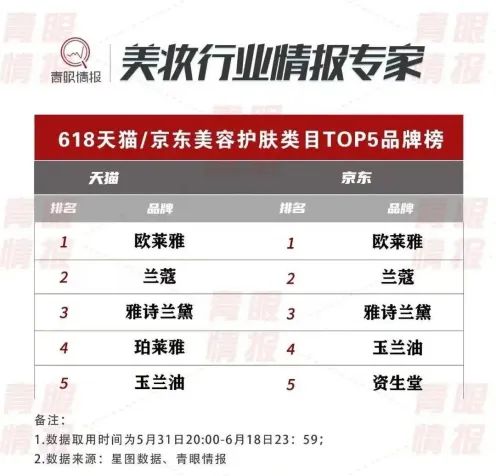 根據(jù)青眼情報整理,今年618天貓平臺SK-II的銷售額為2.6億元,排在第11位,而蘭蔻的7.2億元和雅詩蘭黛的6.58億元分別是它的2.77倍和2.53倍;其在京東平臺的銷量也跌出了前五的位置。