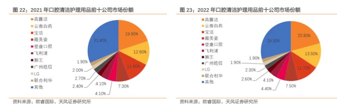 在口腔護(hù)理領(lǐng)域,根據(jù)歐睿國際和天風(fēng)證券研究所的統(tǒng)計,2021年中國口腔護(hù)理用品前三名的公司分別是高露潔、云南白藥、寶潔,市場份額分別為19.90%、12.60%、11.60%,到了2022年雖然前三位的品牌沒有變化,但高露潔和云南白藥市場份額均提高了0.9%,而寶潔僅提高了0.1%。