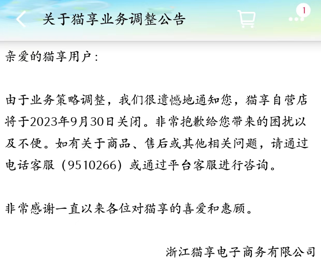 上線至今不足一年半,天貓旗下的自營業(yè)務(wù)貓享,即被按下了暫停鍵。近日,貓享發(fā)布業(yè)務(wù)調(diào)整公告,將于今年9月30日關(guān)閉。