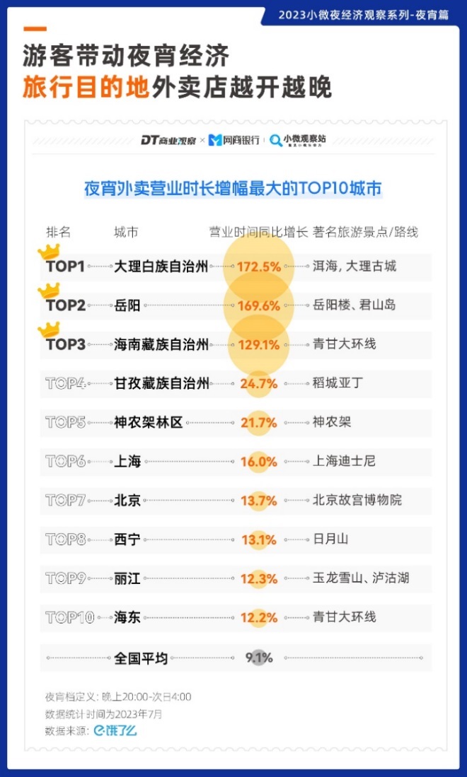 夜宵經(jīng)濟增長,旅游是一大驅動力。 今年營業(yè)時間延長最多的10個城市,80%都是旅游城市,很多還不是“老網(wǎng)紅”。旅游熱,帶動了夜宵熱,來自城市的游客把吃夜宵的習慣帶到大江南北,也帶動了當?shù)夭惋嫿?jīng)濟的發(fā)展。