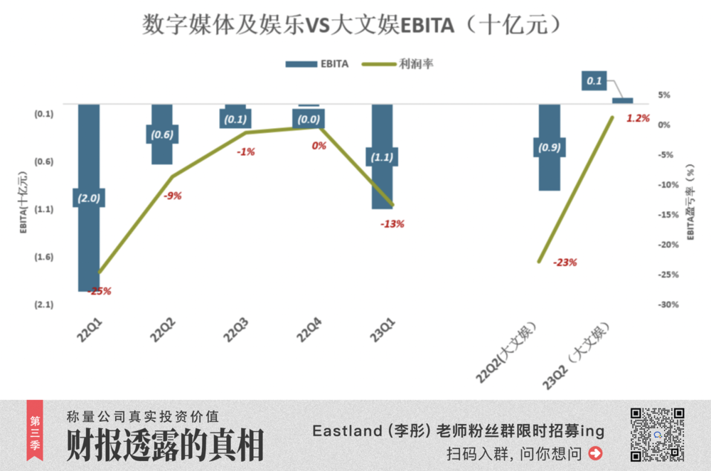 2023年Q1,數(shù)字媒體及娛樂營(yíng)收83億;2023年Q2,大文娛營(yíng)收54億,落差達(dá)28.9億。