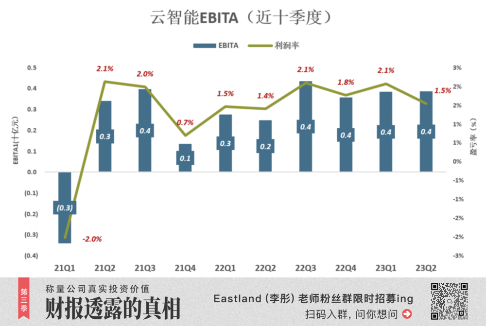 自2021年Q2起,云智能已連續(xù)九個(gè)季度盈利,但營(yíng)收增速趨緩。2023年Q2營(yíng)收251億、EBITA為3.9億,利潤(rùn)率1.5%。