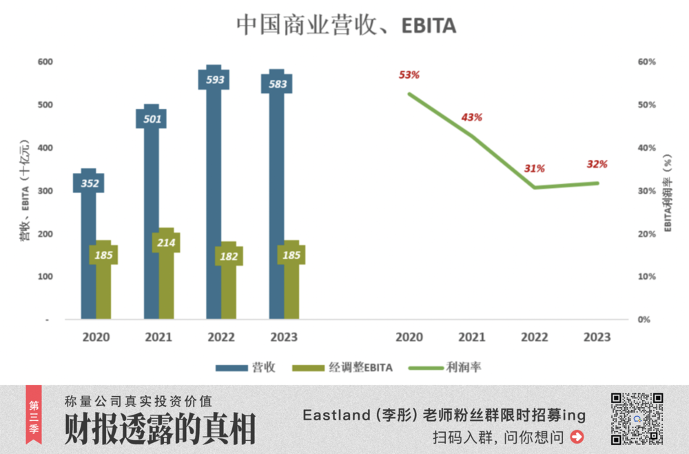 2023財(cái)年,中國(guó)商業(yè)EBITA高達(dá)1849億,利潤(rùn)率31.7%、較2022財(cái)年提高1個(gè)百分點(diǎn);在營(yíng)收下降1.7%的情況下,利潤(rùn)提高了1.5%。