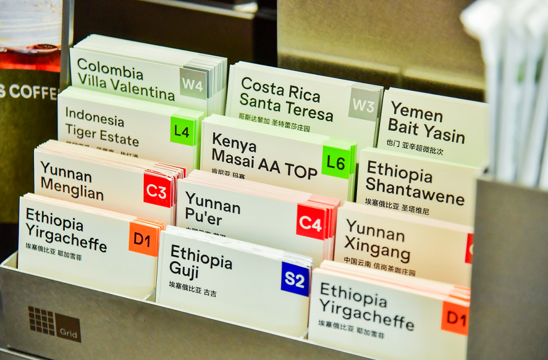 為了方便用戶判斷咖啡豆的品質(zhì)及特點(diǎn),格子咖啡還在門(mén)店陳列了咖啡豆樣本,為每款豆子配上說(shuō)明書(shū),產(chǎn)地、處理方式、風(fēng)味描述一一呈現(xiàn)。
