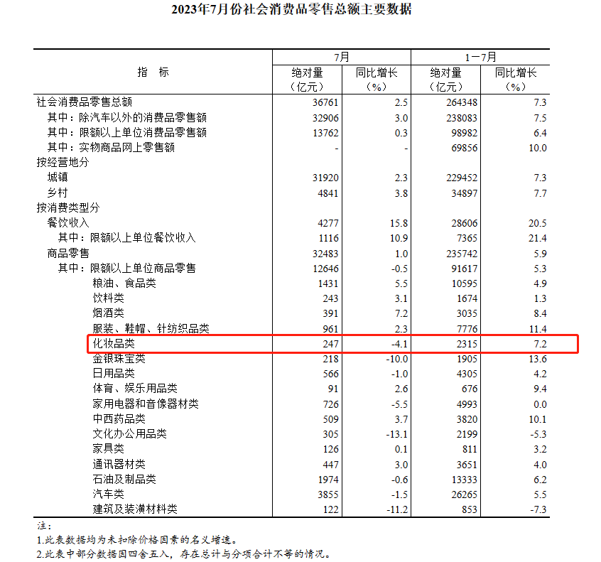 其中,化妝品類1-7月零售額為2315億元,同比增長7.2%,7月零售額為247億元,同比下降4.1%,這也是近四年來我國化妝品零售額首次出現(xiàn)下跌。