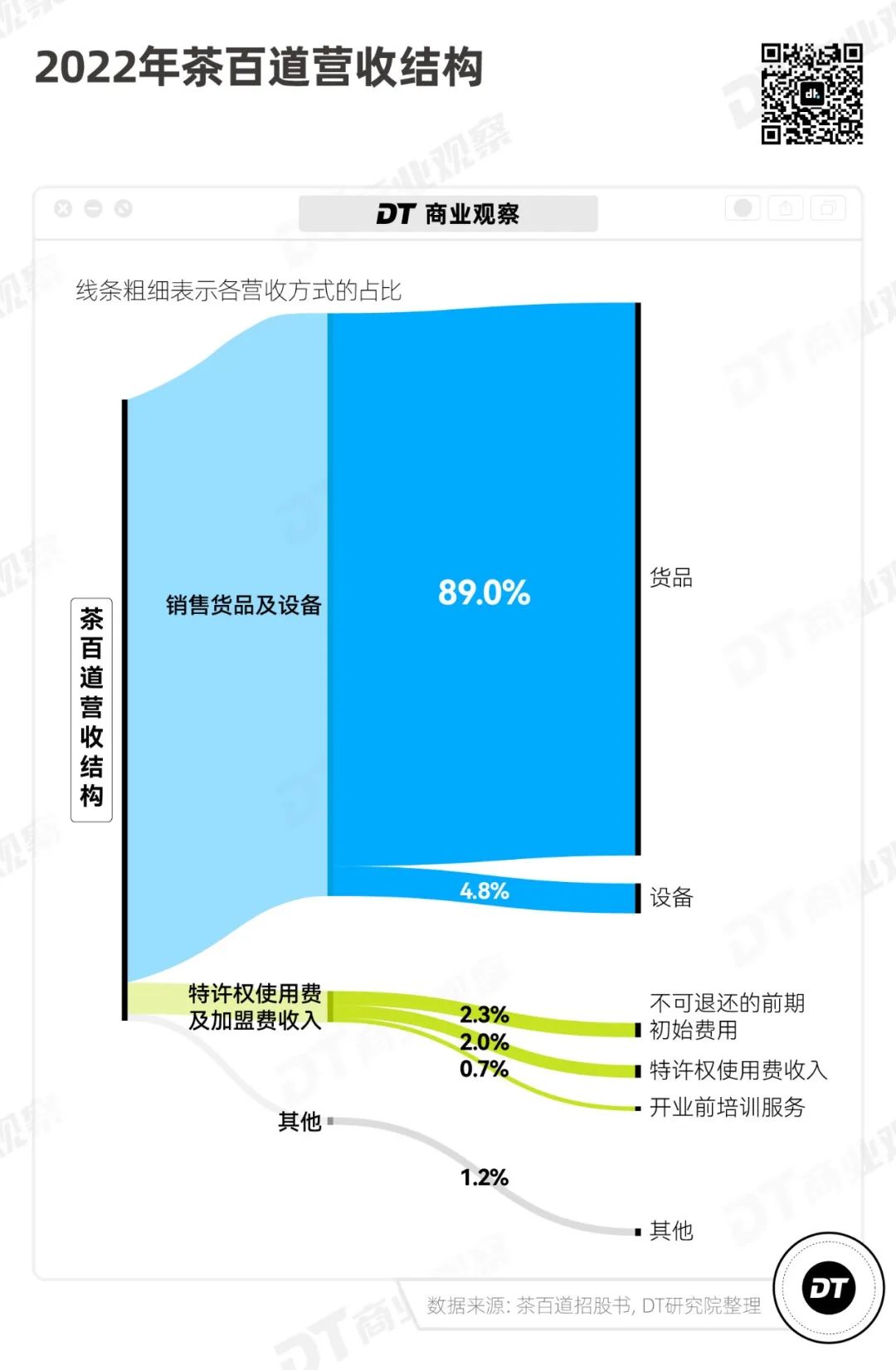 在正式開店之后,茶百道對門店沒有業(yè)績目標(biāo)要求,但門店必須從茶百道進(jìn)口奶茶原材料和相關(guān)設(shè)備——這也是茶百道的主要賺錢來源:超過9成的收入來自于向加盟商兜售貨品和設(shè)備,來自特許權(quán)使用和加盟費(fèi)的收入只占到5%。