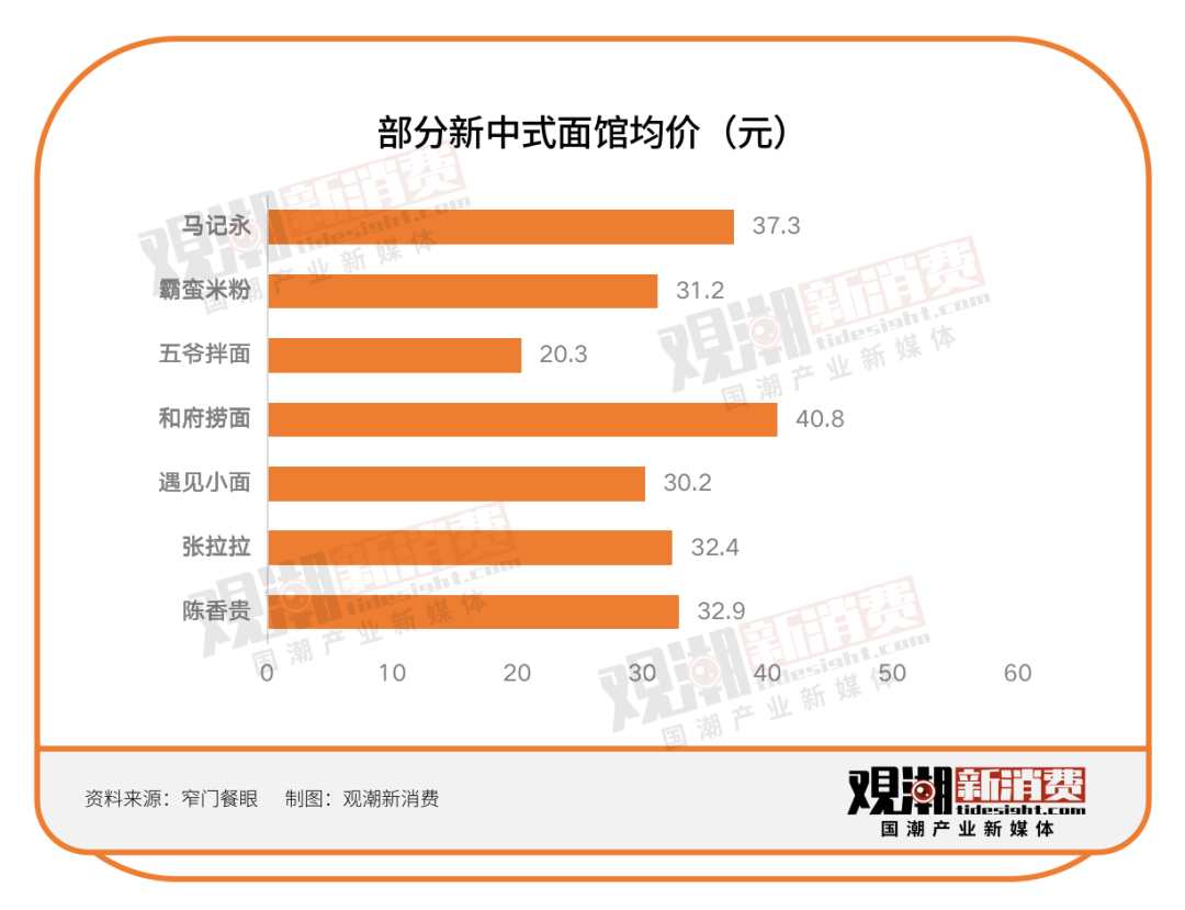 其次,新中式面館的定價較高,平均在32元左右,高者可達40元。