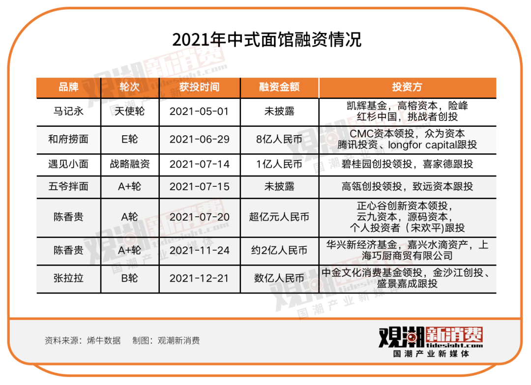 2021年,新中式面館的市場一片熱鬧。陳香貴、馬記永、張拉拉等品牌獲得大筆融資,大舉開店。