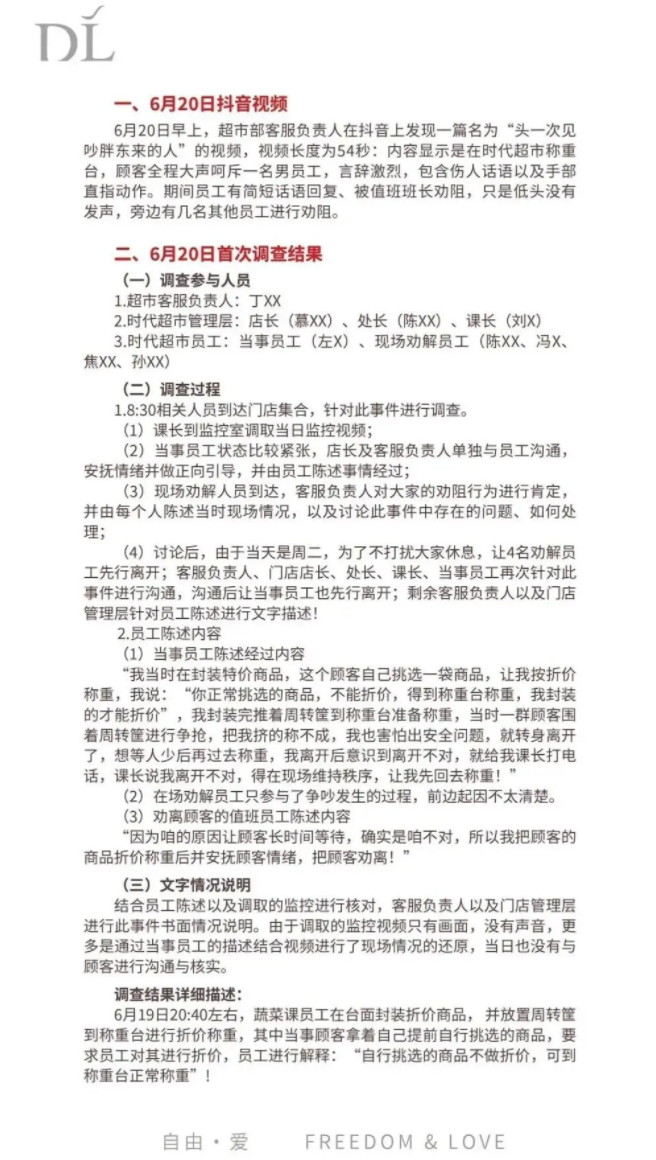 6月底,一位顧客在胖東來(lái)與員工發(fā)生爭(zhēng)執(zhí)。事后,胖東來(lái)發(fā)布了一份長(zhǎng)達(dá)8頁(yè)WORD文檔的調(diào)查通告,詳細(xì)列明了事發(fā)后第2天以及第5天的兩次調(diào)查結(jié)果、處理方案,甚至對(duì)比了兩次調(diào)查的偏差、陳明偏差原因,并就此給出處罰。