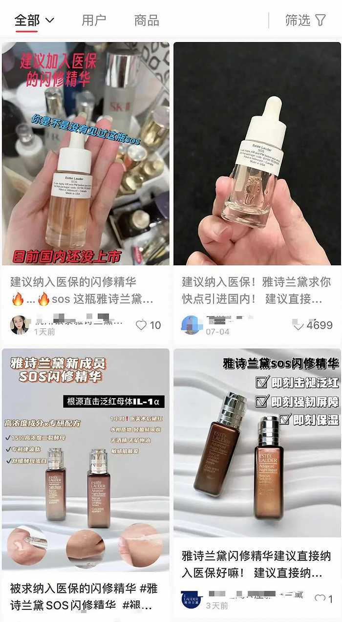 本月初,雅詩蘭黛名為SOS閃修精華的產(chǎn)品新上市,這是雅詩蘭黛的第一款針對(duì)皮膚屏障護(hù)理的產(chǎn)品,但在前期種草階段預(yù)熱期間因?yàn)榇罅渴褂谩敖ㄗh納入醫(yī)!钡刃麄髯盅垡l(fā)廣泛的質(zhì)疑。
