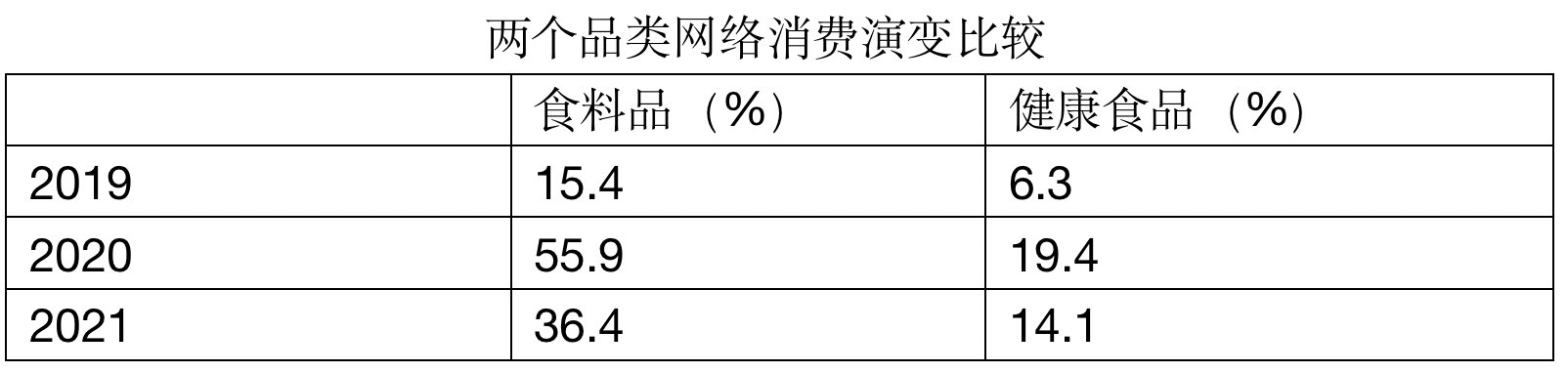 除了上述列舉品類(lèi)以外,統(tǒng)計(jì)數(shù)據(jù)顯示,2019年到2021年三年之間,食品類(lèi)的網(wǎng)絡(luò)渠道業(yè)績(jī)也出現(xiàn)快速增長(zhǎng)趨勢(shì)。