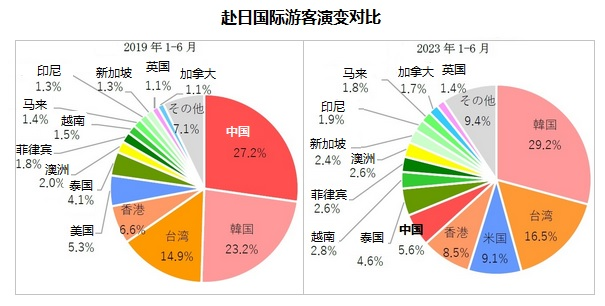 2023年以來(lái),日本國(guó)際入境游客消費(fèi)快速?gòu)?fù)蘇。2023年6月,訪日游客人數(shù)是2019年同期70%,消費(fèi)額恢復(fù)到95%,但是,實(shí)物消費(fèi)占25%,文化事務(wù)類(lèi)消費(fèi)占75%,主要游客來(lái)自歐美、東南亞,韓國(guó)取代中國(guó),入境人數(shù)最多(參見(jiàn)圖示)。無(wú)論人數(shù)還是消費(fèi)額度,相差的那一部分,應(yīng)該就是中國(guó)大陸敢花錢(qián)的那一群人的支持。
