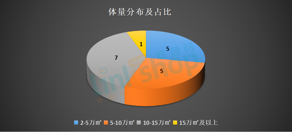 可以看到,5-15萬㎡的中型體量的商業(yè)項(xiàng)目是主流,占比高達(dá)72%。這種體量的商業(yè)項(xiàng)目一般以一站式區(qū)域購物中心為主,如紹興旭輝Cmall、湖州長興萬達(dá)廣場、南通如東喜潤城、北京惠多港購物中心、烏魯木齊米東吾悅廣場等。