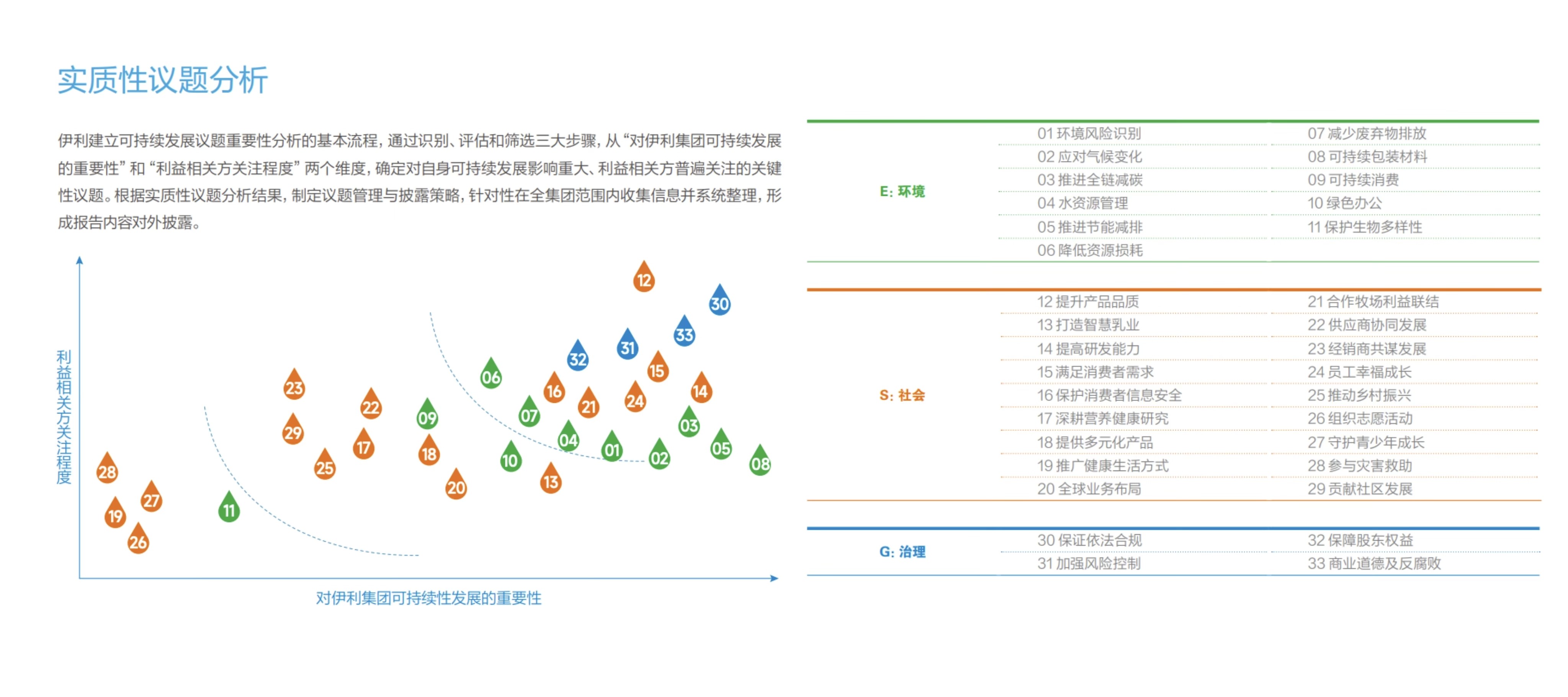 以伊利集團的可持續(xù)發(fā)展報告披露為例,矩陣中的橫坐標代表該議題對于公司可持續(xù)發(fā)展的重要性,縱坐標代表對利益相關方的重要性。從矩陣中可明顯看出提升產品品質、保證依法合規(guī)、商業(yè)道德及反腐敗等是伊利集團識別出來的關鍵議題。