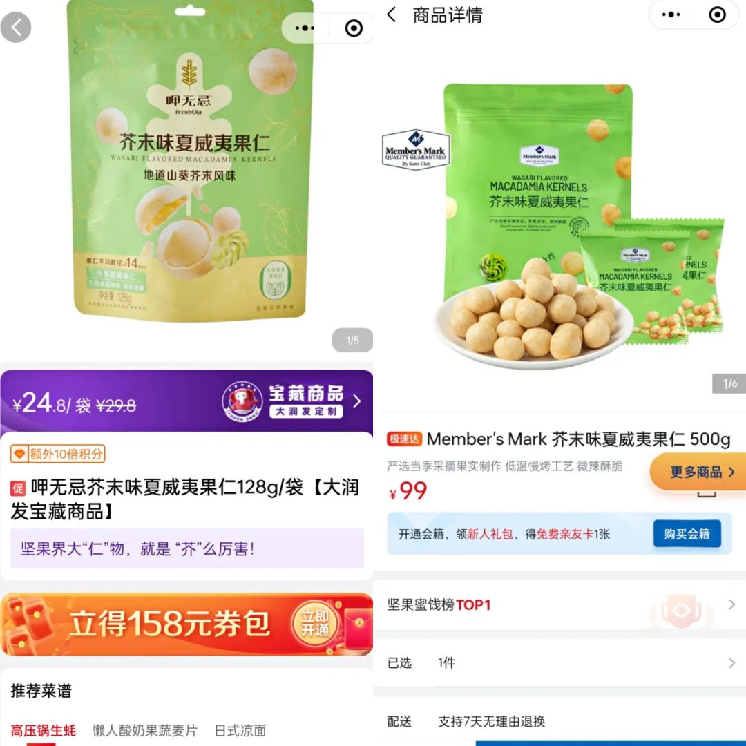 大潤(rùn)發(fā)自有品牌呷無(wú)忌freshOla芥末味夏威夷果仁128g價(jià)格為24.8元,折合每19.4/100g元,山姆的價(jià)格為19.8/100g。