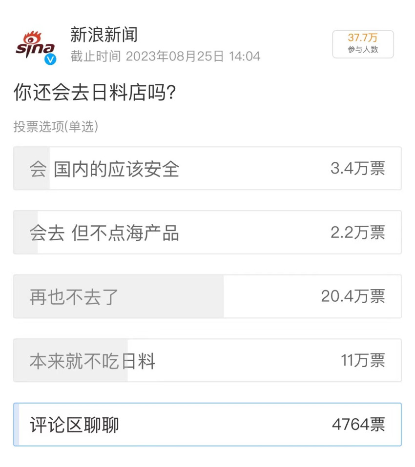 8月24日下午,新浪微博發(fā)起“你還會去日料店嗎?”的投票,截至18時,共計41.6萬人投票。其中,20.4萬人表示“再也不會去”,占總人數的54.08%;僅3.7萬人表示“會,國內的應該安全”,占總人數的0.08%。