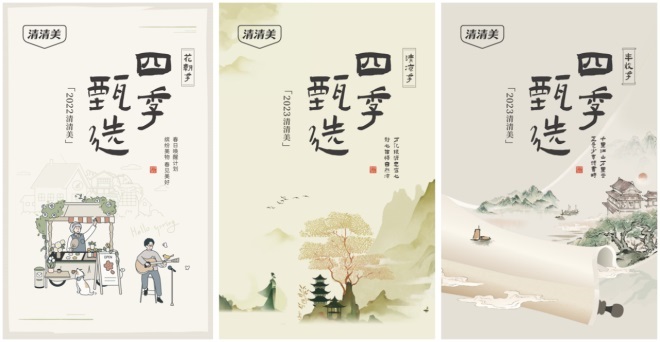 清清美四季甄選的營(yíng)銷推廣有專門(mén)獨(dú)立的包裝設(shè)計(jì)、專門(mén)獨(dú)立的終端形象,其推廣創(chuàng)意依據(jù)主流用戶的消費(fèi)文化 一季一更換、一步一升級(jí)。通過(guò)個(gè)性化的視覺(jué)、場(chǎng)景感十足的陳列氛圍為到店顧客打造出一個(gè)體驗(yàn)感和吸引力極強(qiáng)的消費(fèi)場(chǎng)域。
