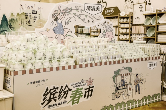 四季甄選的每一季推廣,都會(huì)有一個(gè)精致生活方式的創(chuàng)意主題,將消費(fèi)時(shí)節(jié)、產(chǎn)品屬性、流行文化融合在一起,通過(guò)包裝、陳列等終端視覺(jué)進(jìn)行創(chuàng)意傳達(dá)。例如花朝季的“繽紛春市——春日喚醒計(jì)劃”,其包裝設(shè)計(jì)、陳列地堆都基于春市主題進(jìn)行視覺(jué)元素的應(yīng)用,營(yíng)造出花朝時(shí)節(jié)的氛圍感。通過(guò)升級(jí)消費(fèi)體驗(yàn)場(chǎng)景為門(mén)店形象增值,四季甄選也以此為抓手助力終端贏得了更多的客戶流量。