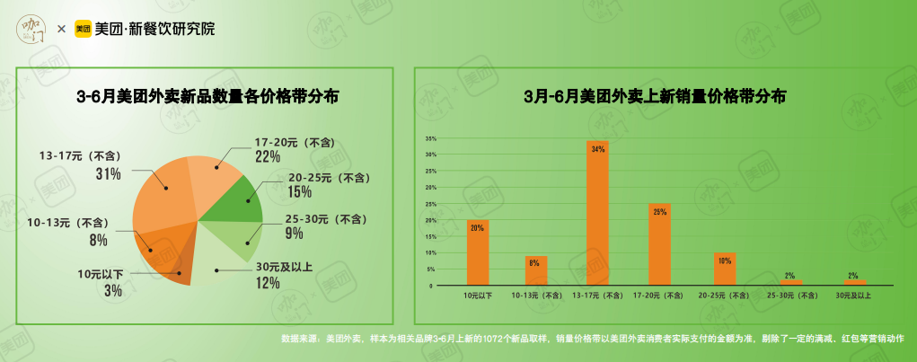 今年3~6月美團(tuán)外賣新品數(shù)量?jī)r(jià)格帶分布中,13~17元占比30%,是上新數(shù)量多的價(jià)格區(qū)間,其次是17~20元占比21%。